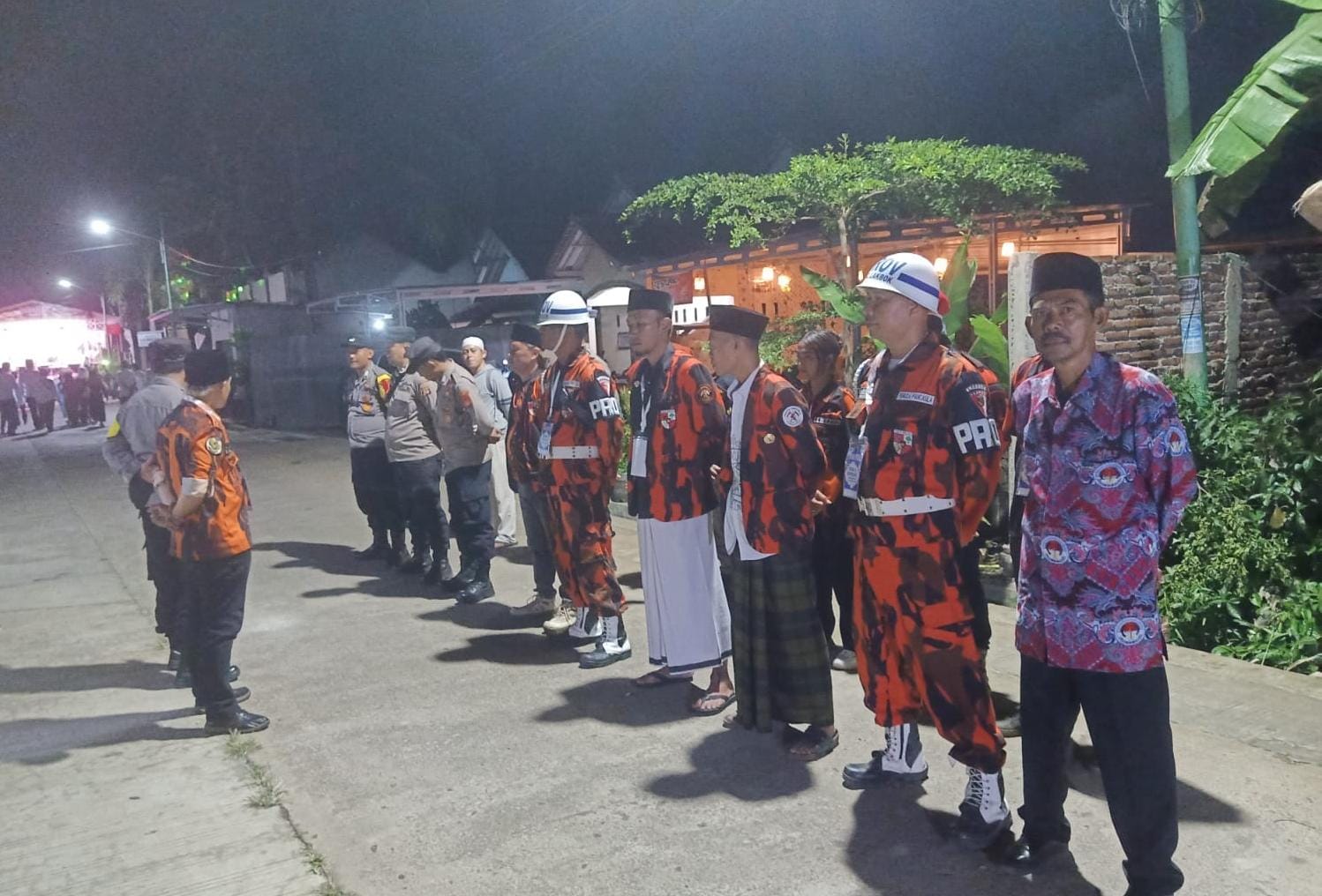 Tampak terlihat sejumlah personel Polri melakukan pengamanan di sekitar lokasi tatap muka paslon bersama warga dalam acada bersholawat bersama. Kegiatan ini Dusun Citamiang RT.003 RW.001, Desa Cintaratu, Kecamatan Lakbok, Kabupaten Ciamis, Jawa Barat, Sabtu, 5 Oktober 2024, malam.