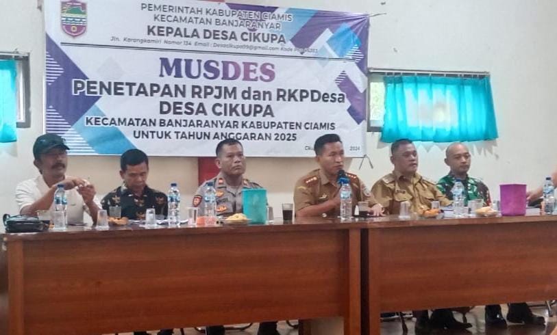 CIAMIS ~ Polsek Banjarsari Polres Ciamis Polda Jabar mengikuti sosialisasi penyusunan RPJMDES Desa Cikupa. Kegiatan itu bertempat di Aula Kantor Desa Cikupa, Kecamatan Banjarsari, Kabupaten Ciamis, Jawa Barat, Senin (30/9/2024).