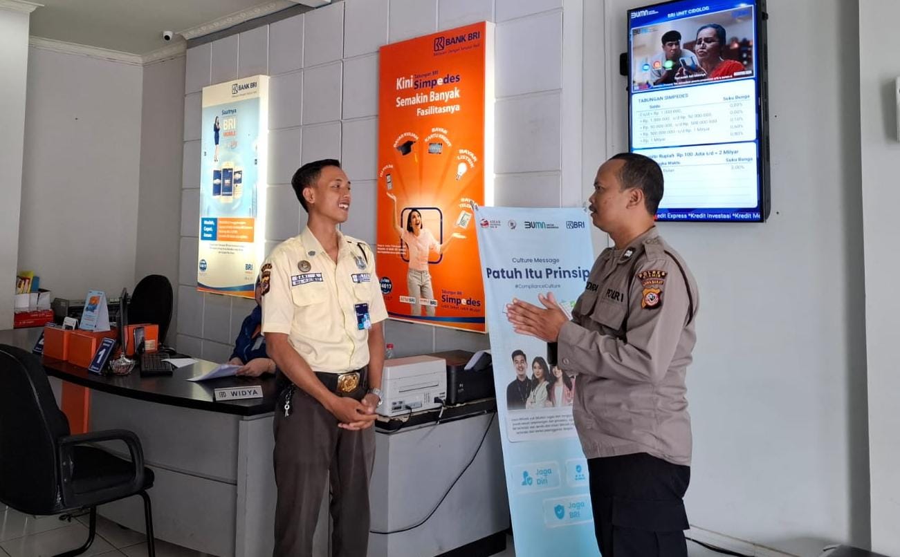 CIAMIS ~ Personel Polsek Cimaragas Polres Ciamis Polda Jabar melaksanakan koordinasi sekaligus pembinaan ke satuan keamanan (Satpam) perbankan di Kecamatan Cimaragas dan Cidolog. Pembinaan kali ini dilaksanakan ke Anggota Satpam Bank BRI Unit Cidolog, Kecamatan Cidolog, Kabupaten Ciamis, Jawa Barat, Kamis (19/9/2024).
